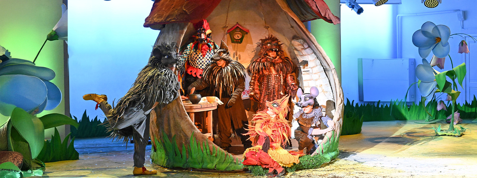 Вдруг появляется Волк. Он стучит в ворота теремка и требует, чтобы их открыли. Но хозяева: Лягушка, Мышка, Петух и Ежик — не пускают серого разбойника в свой дом. Волк грозит им расправой.