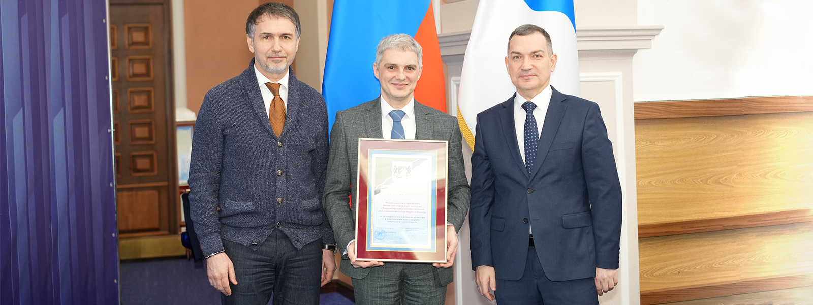Почетную грамоту города мэр Максим Кудрявцев вместе с председателем Совета депутатов города Новосибирска Дмитрием Асанцевым вручили Новосибирскому государственному академическому театру оперы и балета.